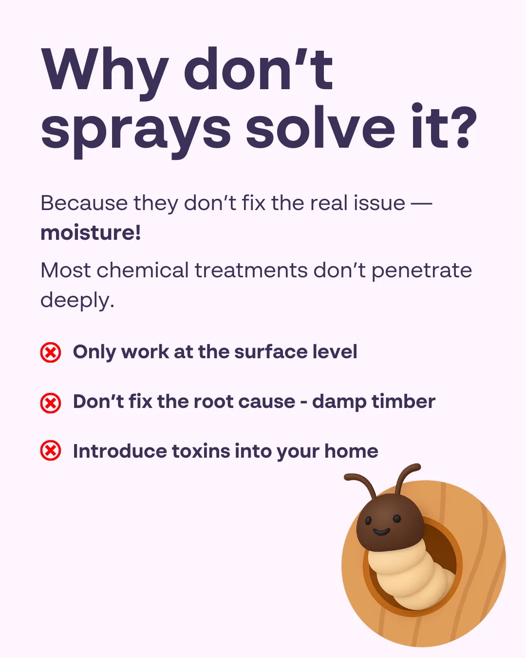 Chemical treatments often promise to “kill the woodworm,” but they rarely penetrate deep enough into the timber to reach any larvae. Most sprays remain at surface level, which might kill a few adult beetles (if they are present), but they do very little to address the real issue — moisture. Worse, they introduce toxins into the home, can harm other insects (even helpful ones), and do nothing to improve the conditions that made the infestation possible.